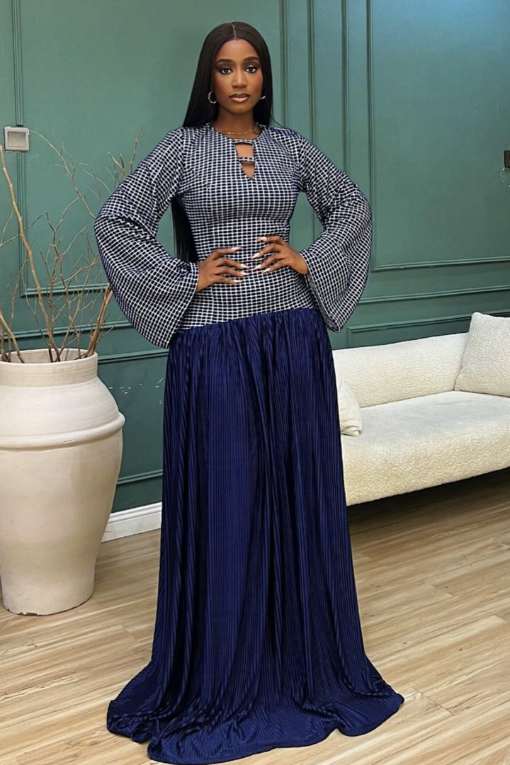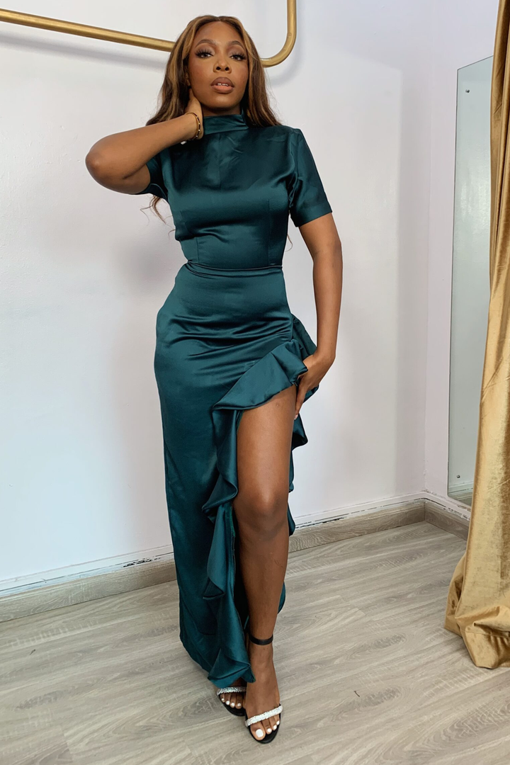 A BEAUTIFUL DRESS WITH RUFFLE DETAIL CUT OUT SLIT MADE WITH LUXURIOUS DUCHESS FABRIC