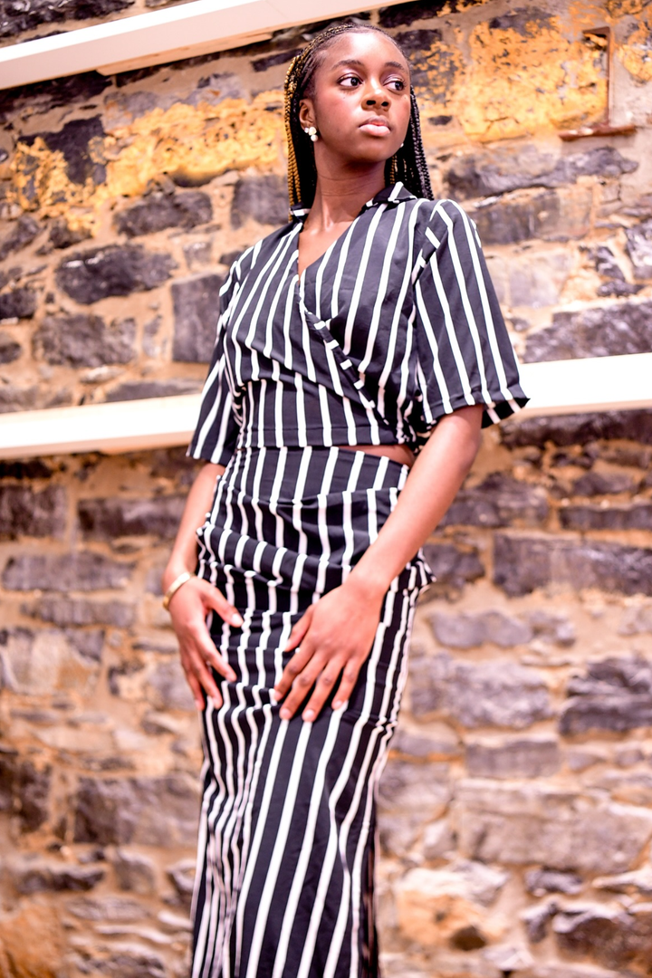Chic two-piece set with crossed 3/4 sleeve top and long black & white striped skirt — elegant and timeless.