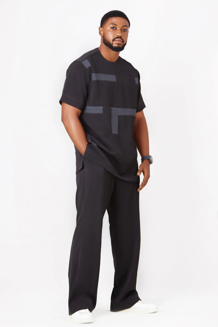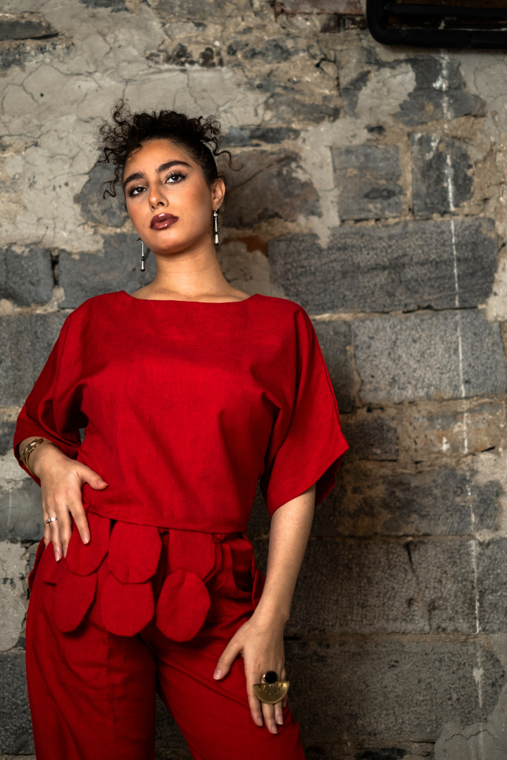 Elegant red two-piece set with centered top, hanging round details, and matching pants — comfort and style combined.